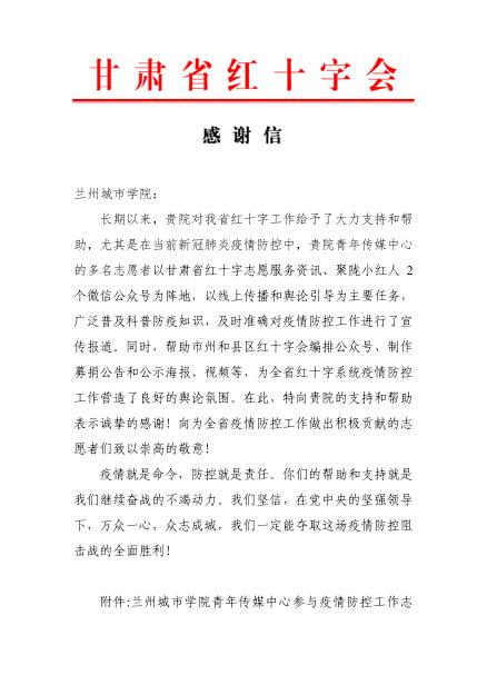 3月6日,点点官网收到甘肃省红十字会发来的感谢信。信中对点点官网青年传媒中心志愿者在疫情防控工作中的积极贡献给予充分肯定,对点点官网提供的支持和帮助表示感谢。