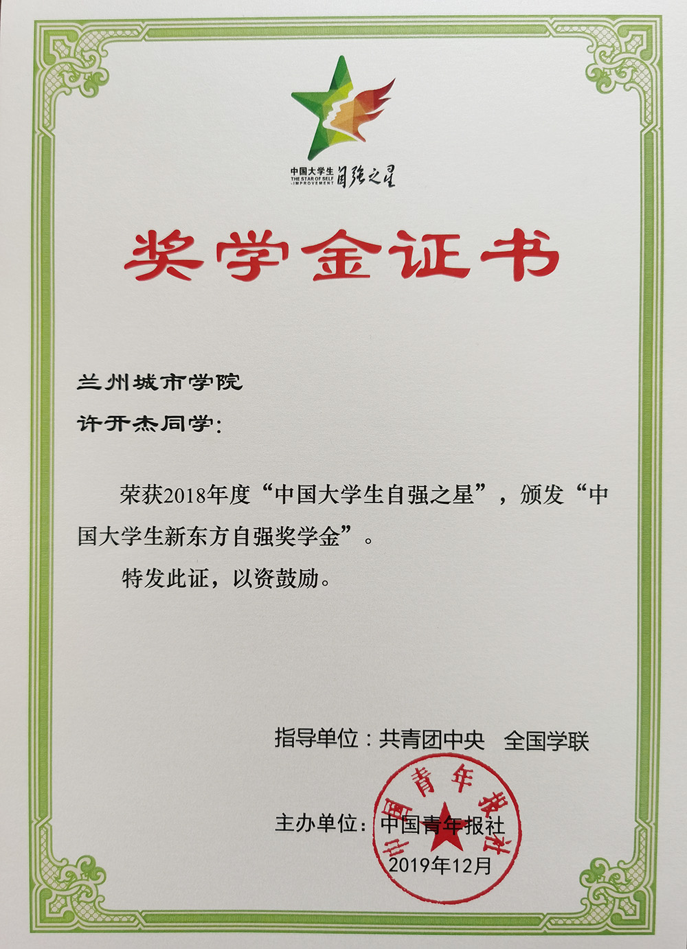 近日,由共青团中央、全国学联共同组织开展的2018年度“中国大学生自强之星”寻访活动结果揭晓,点点官网电子与信息工程学院电子信息科学与技术专业151班学生许开杰荣获2018年度“中国大学生自强之星”荣誉称号,并获得“中国大学生新东方自强奖学金”。
