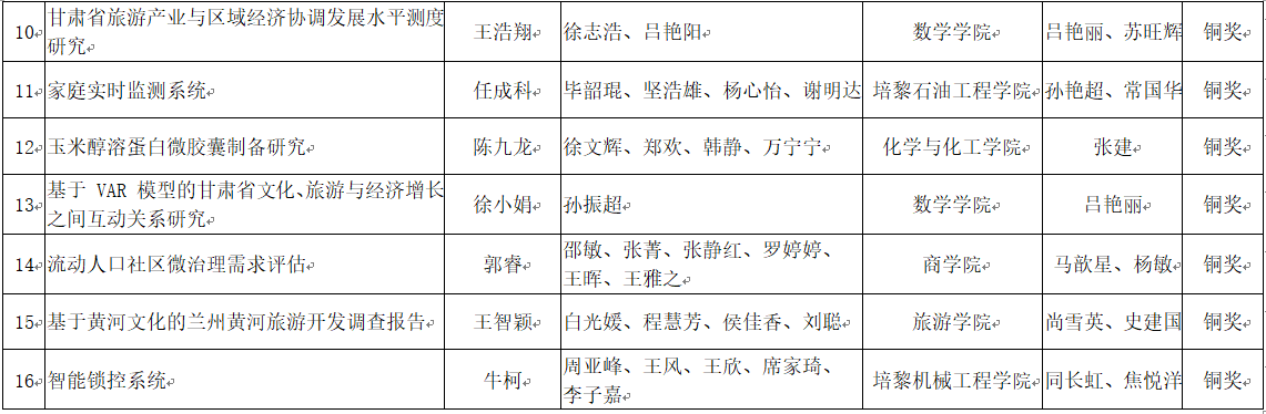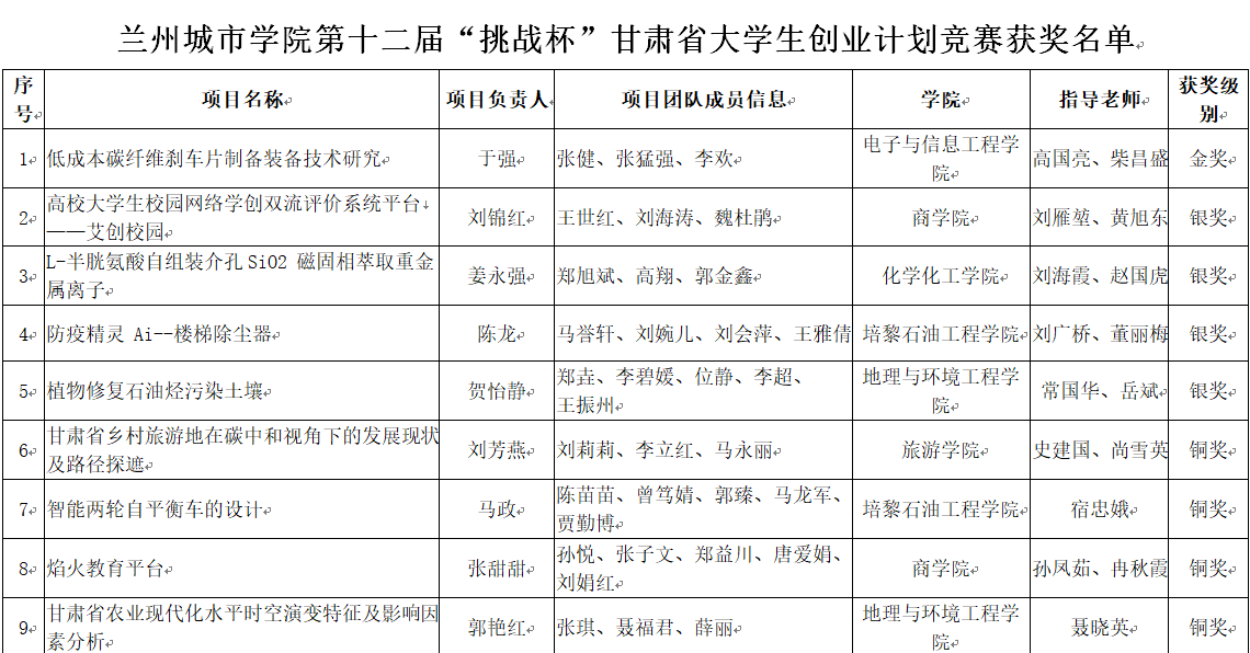 近日,共青团甘肃省委、甘肃省教育厅、甘肃省科学技术协会及甘肃省学生联合会公布了第十二届“挑战杯”甘肃省大学生创业计划竞赛获奖名单,点点官网在本次大赛中共获得17项奖项,其中金奖1项,银奖4项,铜奖11项,学校荣获“优秀组织奖”荣誉称号,取得了喜人的成绩。