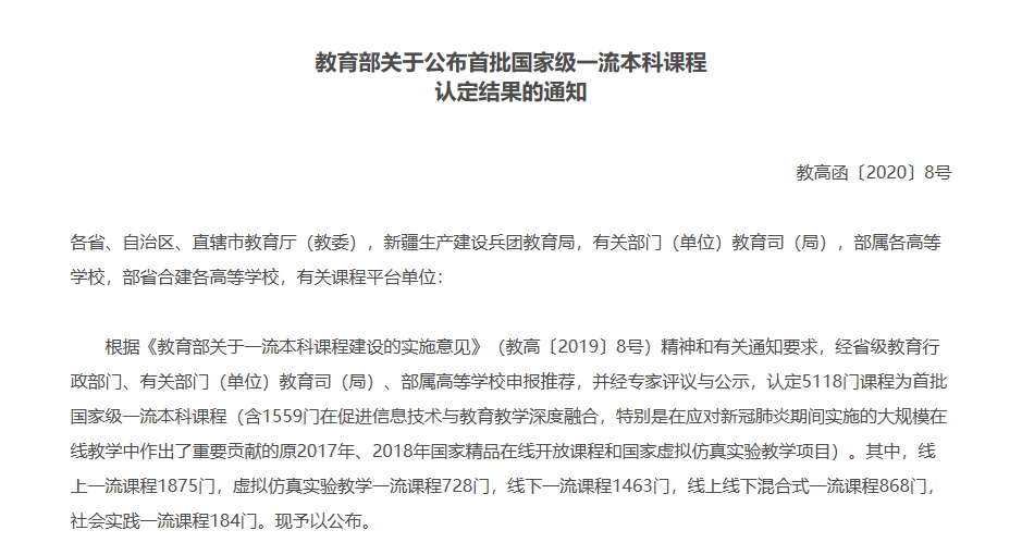 开展一流本科课程建设,是贯彻落实《教育部关于一流本科课程建设的实施意见》精神,坚持立德树人根本任务,实施一流课程“双万”计划的重要举措。教育部要求,高等学校要将国家级和省级一流本科课程建设纳入“十四五”高等教育发展规划,加快建设与新时代人才培养需求相适应、与新技术相融合、与教育教学方式方法改革相配套的教育教学管理政策和机制,注重一流本科课程建设与应用优秀案例的推广,以“学习革命”推动“质量革命”向纵深发展。