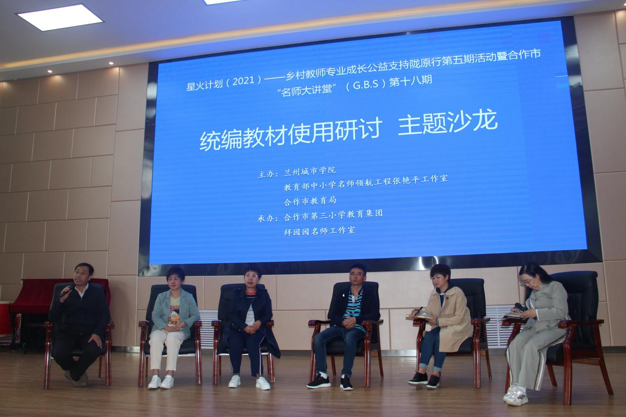 6月20日下午,举办了“统编教材使用研讨主题沙龙”。杨小军代表教育局和一线教师对本次培训表示感谢,表示一线教师一定要用好统编教材,充分挖掘语文课程的思政元素,落实立德树人根本任务,铸牢中华民族共同体意识。合作市第三小学教育集团总校长张建勋表示,培训贯彻“我需要,你给与”的宗旨,通过示范、讲座、沙龙切实为合作市一线教师在教学中的困惑和难点进行答疑解惑,让老师们进一步明确统编教材教什么、怎么教,取得了良好效果。合作市第三小学教师丁枫源说,专家们详细解答了一线教师关于统编教材低段识字量大,课堂时间利用率不高等方面的困惑,指出识字教学要采用渗透式教学,让学生利用课后时间和文字多见面,学会自主学习和与同伴合作交流学习,受益匪浅。藏彩霞老师说,统编教材长课文如何有效分配课堂时间一直是我在教学中的困难,专家们的解答让我明白了“一课一得”,课堂切勿贪多,长文短教;还要学会用好教材,引导学生和教材自主对话。张艳平总结指出,幸福的教师才能教出快乐的儿童,我们每个人就是自己的教育学,只有先明自己、明课程,方可明学生、明他人,深刻理解课程标准,专业使用统编教材,我们一直在路上。