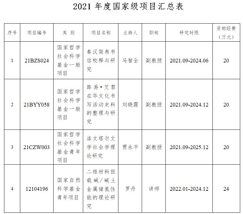 马智全、刘晓霞2位老师分别获得3年研究期限的国家哲学社会科学基金一般项目资助经费立项,贾永平老师获得3年研究期限的国家哲学社会科学基金青年项目立项,罗丹老师获得3年研究期限的国家自然科学基金青年项目立项。