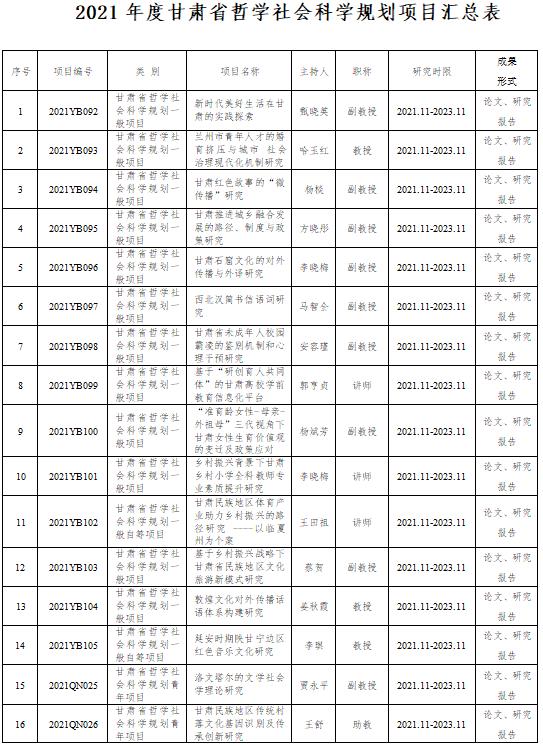 哈玉红等12位老师获得3年研究期限的甘肃省哲学社会科学规划一般项目资助经费立项,李琪等2位老师分别获得3年研究期限的甘肃省哲学社会科学规划一般自筹项目立项,贾永平等2位老师分别获得3年研究期限的甘肃省哲学社会科学规划青年项目立项。