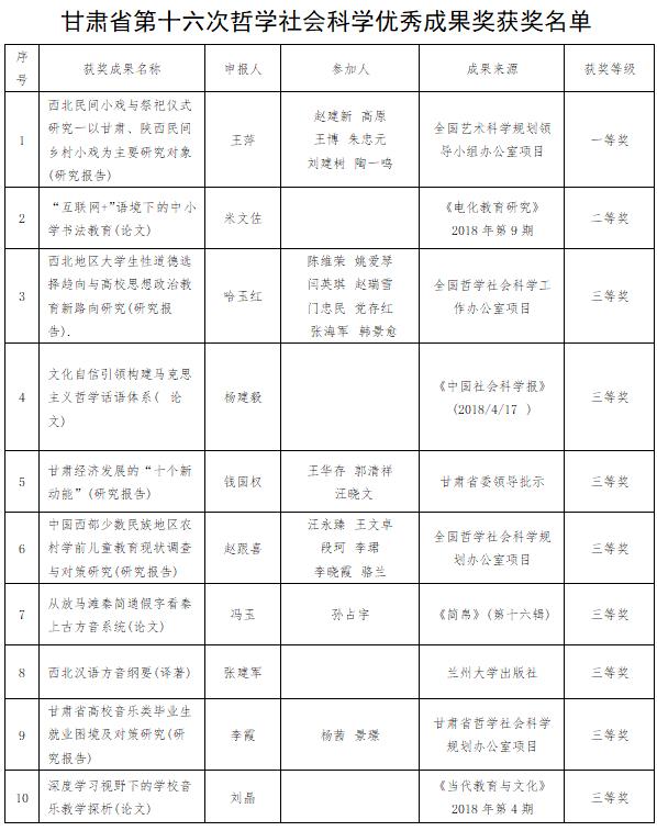 其中,王萍团队的科研成果《西北民间小戏与祭祀仪式研究一以甘肃、陕西民间乡村小戏为主要研究对象(研究报告)》获甘肃省第十六次哲学社会科学优秀成果奖一等奖;米文佐老师的科研成果《“互联网+”语境下的中小学书法教育(论文)》获甘肃省第十六次哲学社会科学优秀成果奖二等奖;哈玉红老师等八个团队申报的成果分别获甘肃省第十六次哲学社会科学优秀成果奖三等奖。