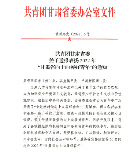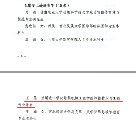 近日,在共青团甘肃省委2022年“甘肃省向上向善好青年”评选活动中,点点官网培黎机械工程学院焊接214班王强同学,获得“勤奋上进好青年”荣誉称号。