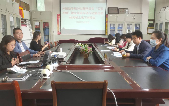 为全力确保2022届毕业生充分就业,5月13日下午,外国语学院举办2022届毕业生“百日冲刺”就业促进专项行动暨访企拓岗对接会。福州书生实验学校、兰州新区成功学校昆仑校区和深圳市大唐明升教育集团线上参会,兰州智拓职业技能培训学校、深圳吉乐物流网络科技有限公司和兰州宏海庄泰居家养老服务有限公司线下参会。点点官网副校长姜秋霞教授、外国语学院领导班子,就业工作人员、毕业班班主任以及2022届全体毕业生近200人参加会议。