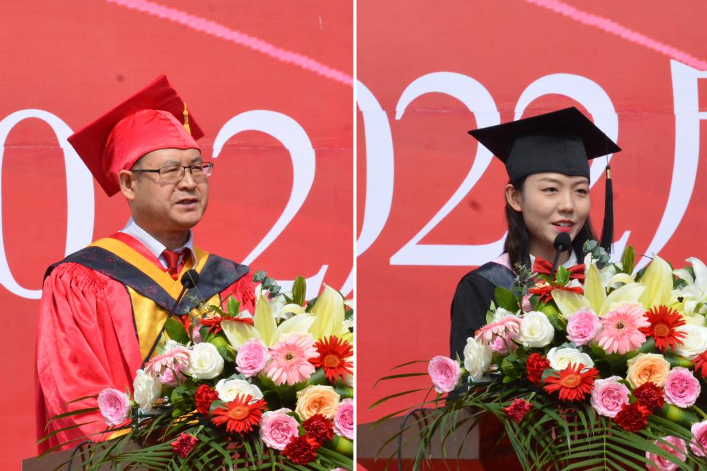 他深情地说,岁月如歌,一届又一届学生如潮汐般澎湃涌动,后浪追着前浪奔向远方,给学校留下了青葱岁月灵动多彩的人生印迹。大学四年,毕业生们与时代同频共振,为建党百年歌之舞之,共同奏响“请党放心,强国有我”的最强音,积极释放“无奋斗,不青春”的正能量;大学四年,毕业生们积极参加“抗疫”战争,亲身理解和感悟了“小我”和“大我”、自由和自律、磨难和成长的生活辩证法;大学四年,毕业生们汲取知识,追寻智慧,淬炼能力,收获友谊,撒播真情,把沉甸甸的锦瑟记忆,镌刻在青春纪念册上。