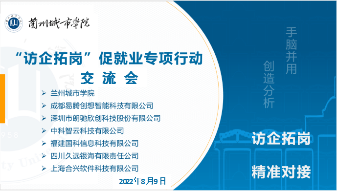 根据《教育部办公厅关于开展全国高校书记校长访企拓岗促就业专项行动的通知》等文件精神要求,学校深入贯彻落实高校书记校长访企拓岗促就业专项行动。8月9日上午,学校与成都易腾创想智能科技有限公司、深圳市朗驰欣创科技股份有限公司、中科智云科技有限公司、福建国科信息科技有限公司、四川久远银海有限责任公司、上海合兴软件科技有限公司等6家企业开展“访企拓岗”促就业专项行动线上交流会。校党委副书记、校长曹洁,校党委常委、副校长李慕堂,招生就业处、信息工程学院、培黎机械工程学院、电子工程学院及各企业负责人参加会议。