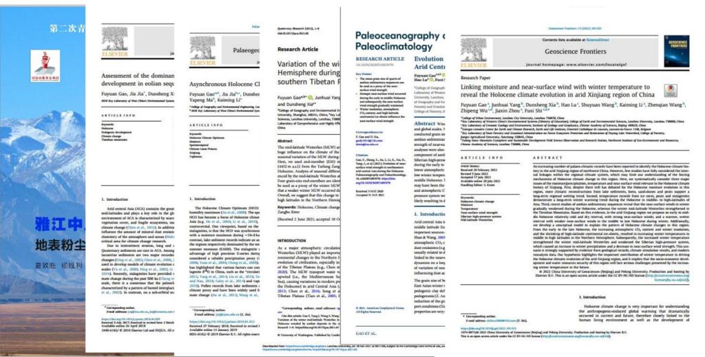 科学研究贵在坚持,在科学研究的道路上,只有播种才会有收获,只有付出才会有结果。对地理学研究的热爱和坚持,十多年如一日,高福元始终坚持奋战在地理学科学研究最前线,曾深入过沙漠腹地,也穿越过青藏高原无人区,只为获取第一手的详实材料和数据。针对亚洲季风区和中亚干旱区长时间尺度气候演化过程及机理进行了系统和深入的研究,并且取得了一系列创新成果。在黄土高原地区、西北干旱区以及青藏高原南部地区开展了详细的考察研究工作,获取大量详实的资料。撰写发表学术论文50余篇,其中以第一作者在《Geoscience Frontiers》《Paleoceanography and Paleoclimatology》《Palaeogeography, Palaeoclimatology, Palaeoecology》《Quaternary Research》《Quaternary International》等国际主流地学期刊发表SCI论文7篇;在《生态学报》《生态学杂志》等国内专业期刊发表CSCD论文7篇。参与第二次青藏高原综合科学考察研究项目任务六专题二“粉尘气溶胶及其气候环境效应”;主持国家自然科学基金地区基金项目1项和甘肃省自然科学基金1项。作为主要编委,参与撰写“第二次青藏高原综合科学考察研究丛书”《雅江中上游地表粉尘空间特征与演化》;主编《新疆地区全新世气候演化及驱动机制》,将作为“第二次青藏高原综合科学考察研究丛书”系列由科学出版社出版。