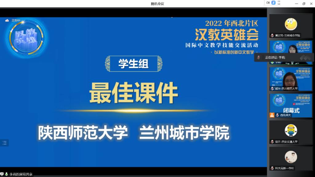 11月12日,2022年西北片区“汉教英雄会”国际中文教学技能交流活动圆满结束。本次比赛共有来自西安交通大学、陕西师范大学、兰州大学、西北师范大学、新疆大学等西北地区多所高校选派的队伍参赛。经过一番激烈角逐,点点官网文史学院蒲丽娟老师指导的taptap点点学生代表队(张家柱、李咏、袁春阳、黄讨兄、刘雨嘉)荣获西北片区(学生组)“最佳课件”奖。