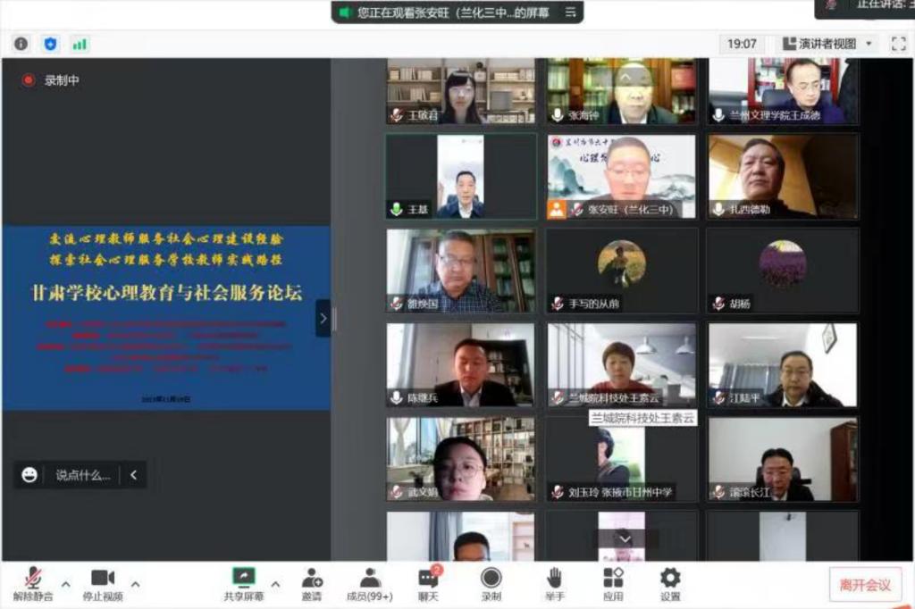 论坛活动期间,城市社会心理研究智库主任张海钟教授作了题为《红色文化基因传承与当代中国社会心理建设》《学校心理教育与社会服务的实践与理论反思》的主题报告。智库学术委员会委员、兰州文理学院王成德教授、甘肃中医药大学江陆平副教授分别作了题为《发挥高校资源优势助力社会心理服务》和《国内社会心理服务体系建设的实践与展望》的主旨报告。各心理单位、协会负责同志分别对心理教育与社会服务成果情况进行了全面系统的总结汇报。
