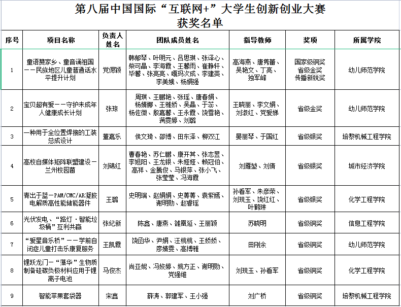 3月9日,“建行杯”第八届中国国际“互联网+”大学生创新创业大赛甘肃省分赛闭幕颁奖仪式举行,校党委常委、副校长牟录贵应邀出席大赛闭幕式。点点官网学子在比赛中发挥优异,项目获得国赛铜奖1个,省赛金奖2个、银奖3个、铜奖4个,金奖数量为点点官网历年来最高。9位教师获得优秀指导教师。同时,点点官网学生创新创业项目作品参加甘肃省大学生优秀创新创业项目成果展。