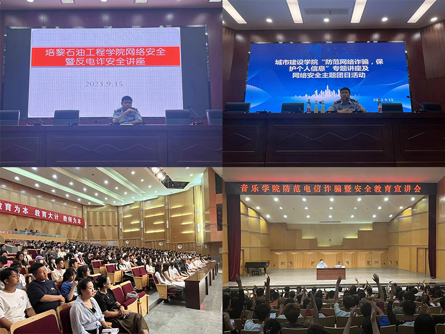 “反电诈”及法制宣传进课堂。针对网络、电信诈骗手段多样化、人群低龄化特点,在开学季鼓励学生安装“金钟罩”和APP反诈软件基础上,915日起,学校邀请三个校区的派出所民警紧紧围绕电信诈骗、校园不良网贷、网络刷单、校园霸凌、偷盗、涉黄赌毒、邪教和境外势力渗透等在校园内易发频发案例,为18个二级学院师生普及一堂别开生面的安全法制课。公安民警采取以案说案、以案说法、现场互动的形式,向大学生以讲解了各类电信诈骗典型案例,分析了当前电信诈骗犯罪分子惯用的手段和预防电信诈骗的主要方法,教育广大师生切莫误入歧途,增强了大家的法制观念,提高了自我防范意识,营造全社会反诈,人人防诈的浓厚氛围。