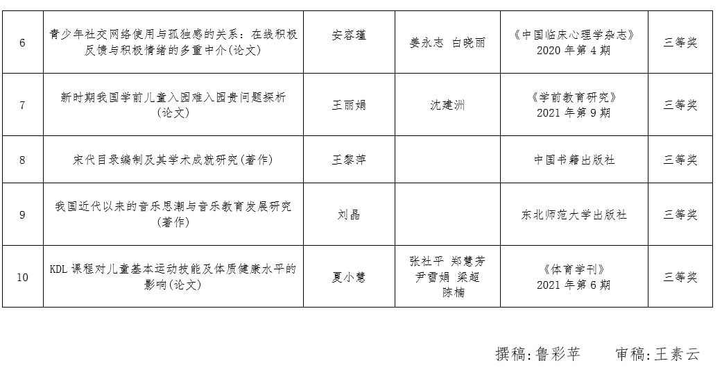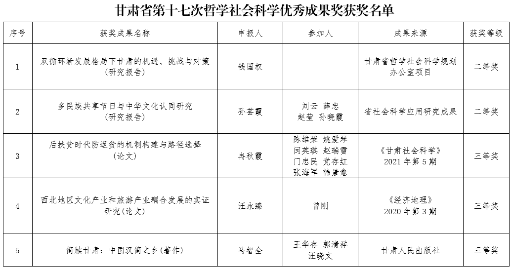 《双循环新发展格局下甘肃的机遇、挑战与对策》(研究报告)《多民族共享节日与中华文化认同研究》(研究报告)项成果获二等奖,《后扶贫时代防返贫的机制构建与路径选择》(论文)等8项奖三等奖。此外,点点官网作为参与单位的3项研究成果获得二等奖1项、三等奖2项。