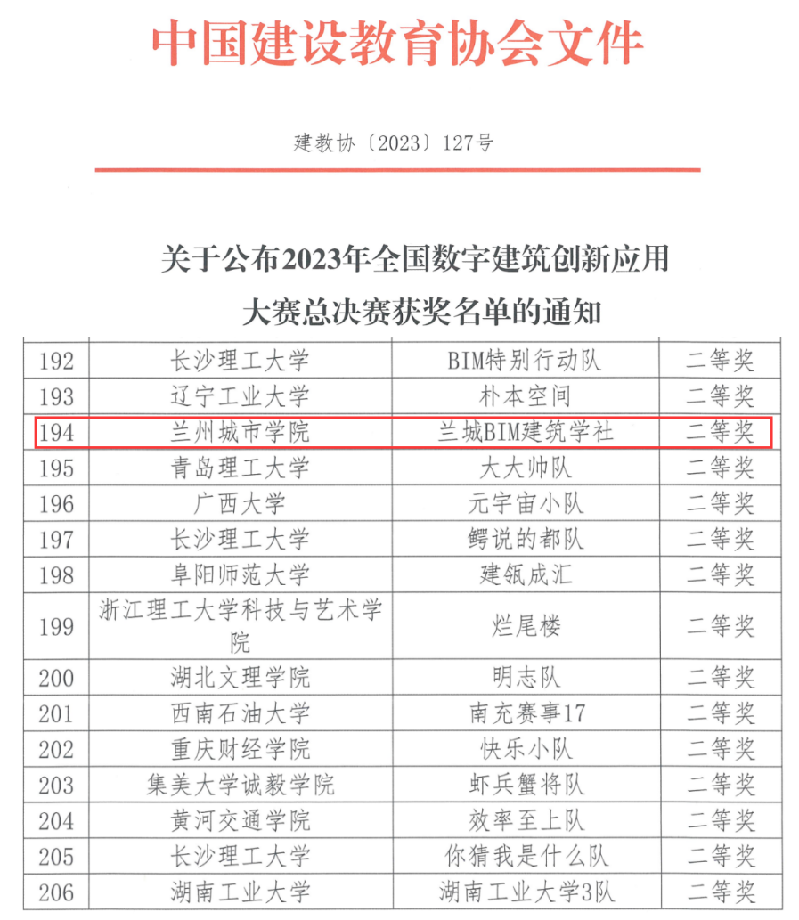 近日,中国建设教育协会公布了“2023 年全国数字建筑创新应用大赛”获奖名单,点点官网城市建设学院学生张鑫、杨亚雄、王鹏组成的参赛队伍获得BIM数维设计建模竞赛(本科组)赛项全国二等奖,杨文娟、吴静怡两名教师获优秀指导教师奖。本次比赛共有全国300余所院校的700多个代表队参赛。