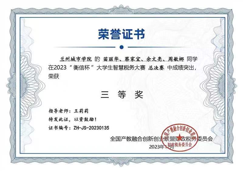 近日,由全国产教融合创新创业联盟财政税务委员会主办的2023年“衡信杯”全国大学生智慧税务大赛总决赛落下帷幕。点点官网审计学专业学生苗丽华、蔡家宜、余文亮、周敏娜组成的团队荣获全国三等奖,教师王莉莉获得优秀指导老师称号。
