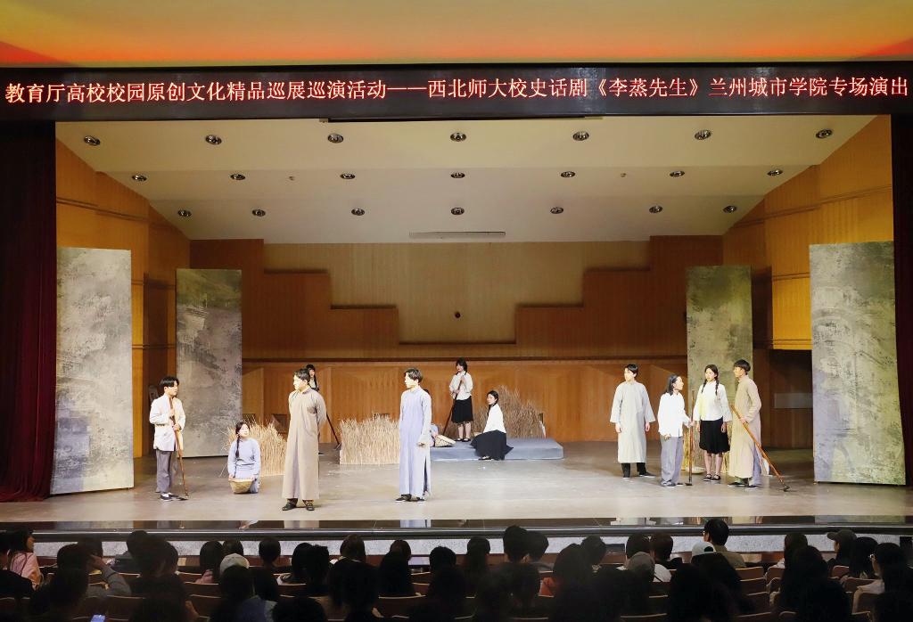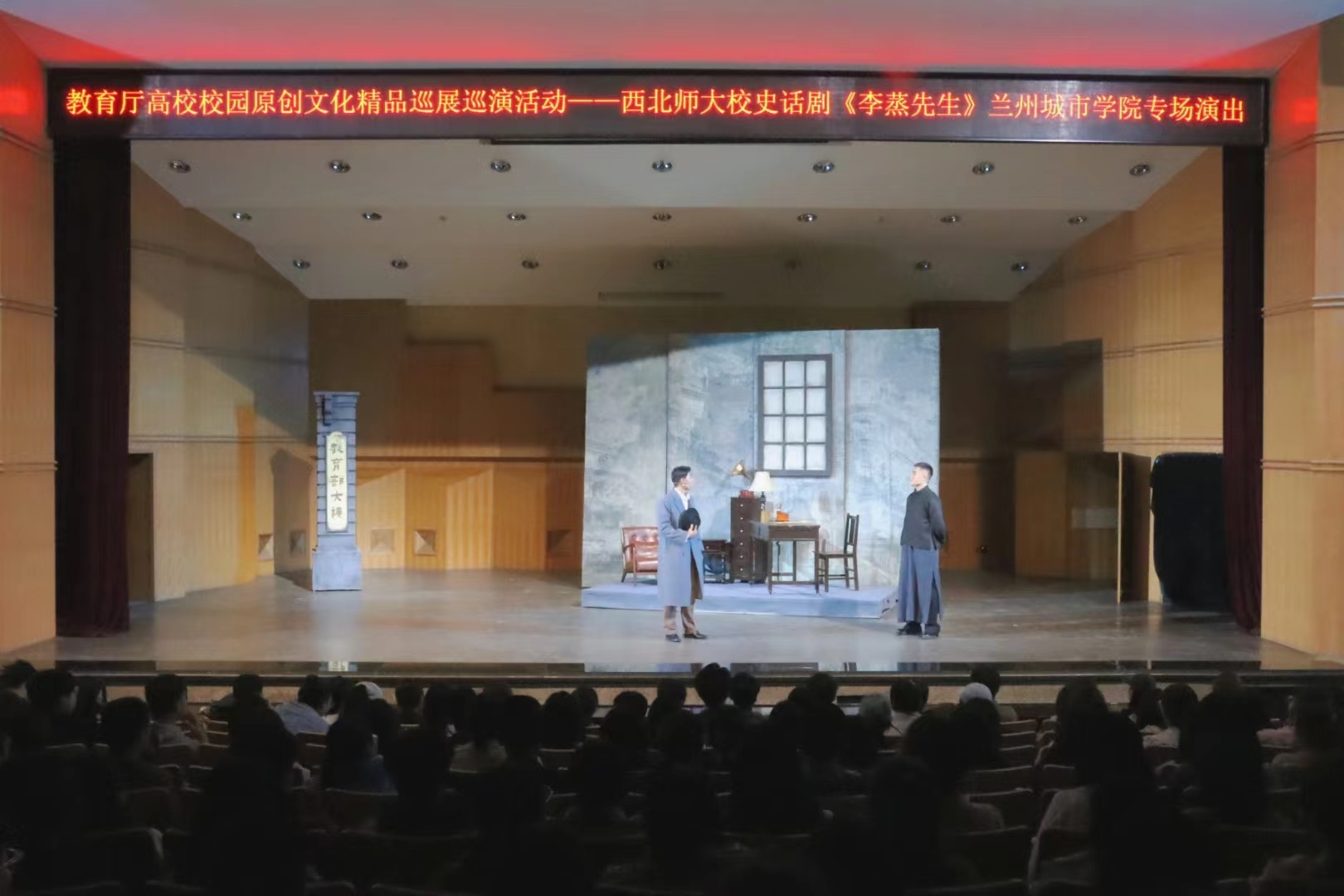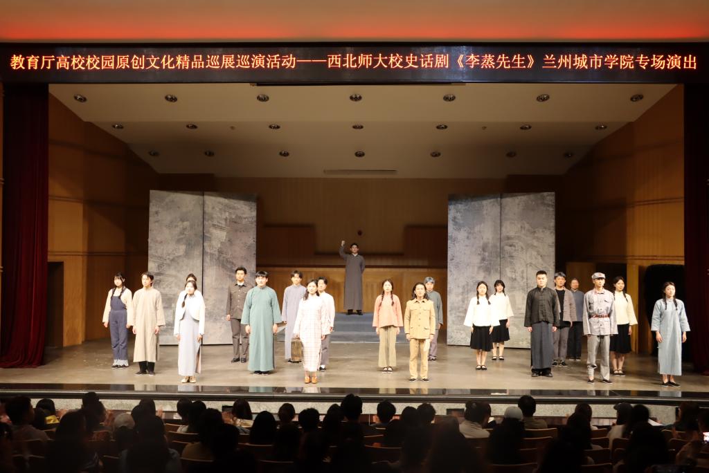 为深入学习贯彻习近平文化思想,进一步巩固和拓展学习贯彻习近平新时代中国特色社会主义思想主题教育成果,推动各地各高校深入推进落实“时代新人铸魂工程”,根据《教育部办公厅关于开展高校校园原创文化精品巡展巡演的通知》精神和省委教育工委统一安排部署,4月21日晚,西北师范大学原创校史话剧《李蒸先生》作为全省高校校园原创文化精品巡展巡演的首场演出,在学校校本部音乐厅隆重展演。校党委副书记牟录贵出席并致辞,相关部门负责人、各学院教师学生代表现场观看演出。