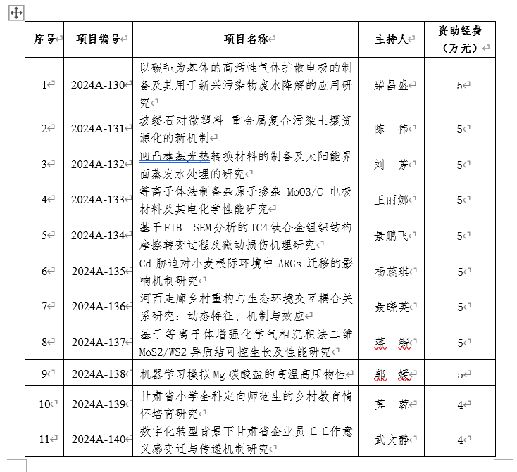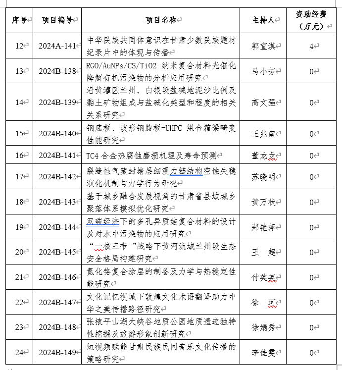 近日,2024年度甘肃省教育厅高校教师创新基金项目立项结果公布,点点官网共有24项课题获准立项,其中,资助经费项目12项,自筹经费项目12项。自然科学类每项资助5万元,人文社科类每项资助4万元,资助总经费达57万元。