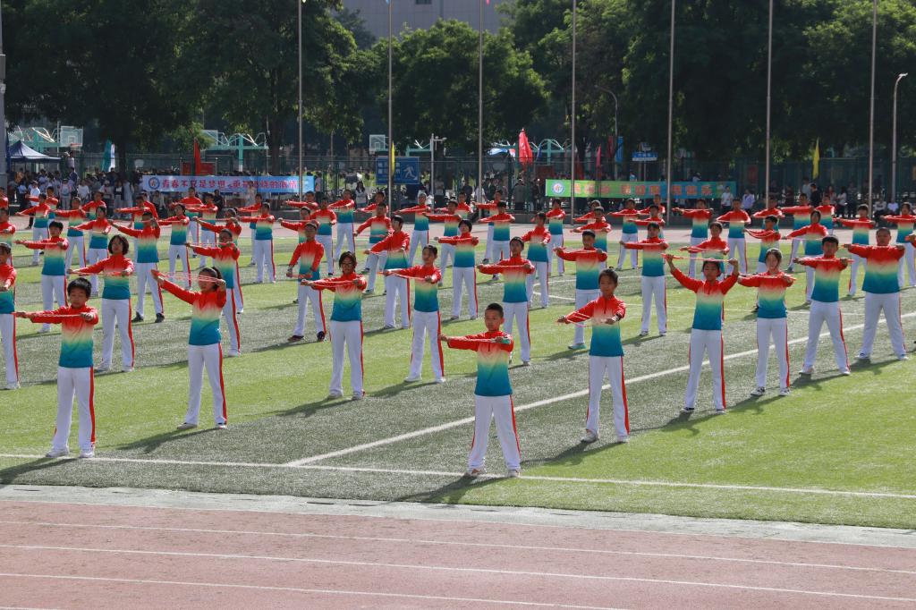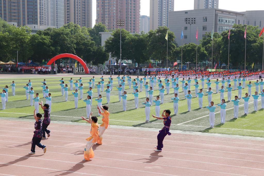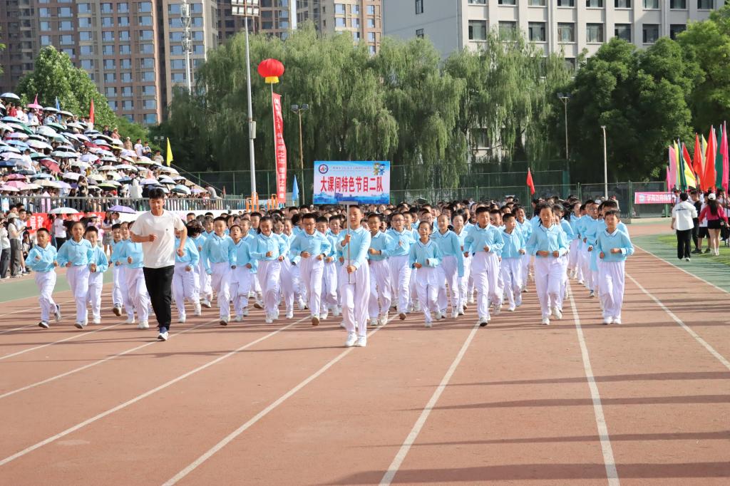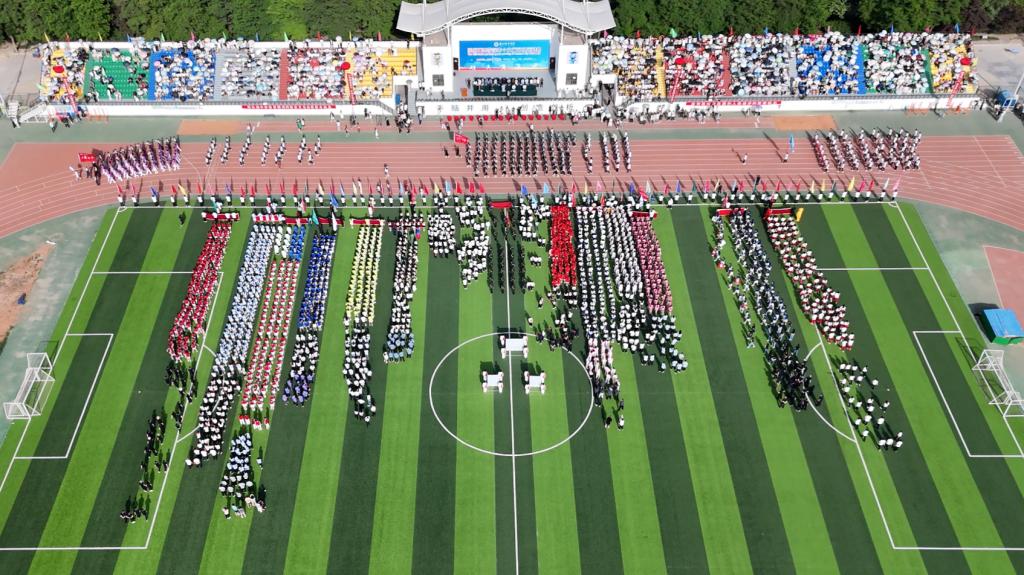 楼丽超、姚德乐分别代表全体裁判员、全体运动员宣誓。随后,外国语学院师生带来《上春山》健美操表演,节目编排高雅精致,动作舒展优美,充分展示出城院学子朝气蓬勃、奋发向上、阳光自信的精神风貌。体育学院与安宁堡小学带来“千字文”武术操表演,古老的武术运动和现代歌曲巧妙配合,孩子们起势出拳、动作有力,一招一式行云流水,目光如炬、身形敏捷,气势如虹,既发扬了武术精神,又弘扬了传统文化。华中师范大学安宁附属实验学校带来的花样跳绳表演中,队形交错变幻、节奏跃动灵活,动作娴熟自如,充分展现了“以绳健体、以绳会友、以绳促德、以绳增智”的理念。健身操决赛之际,各团体操代表队分批登场,队员们服装绚丽、精神饱满、热情洋溢,在奋进旋律中,旋转跳跃、变换队形、默契配合,尽显激昂青春和无限活力,为观众带来了一场酣畅淋漓、精彩震撼的视觉盛宴。