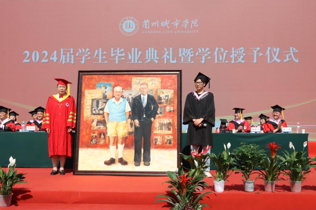 校党委书记曹洁代表学校接受了由艺术设计学院毕业生代表全体毕业生向母校赠送油画《寻找艾黎》,表达对母校的美好祝愿。毕业生代表向老师、家长送上鲜花,感谢老师与父母的悉心栽培与辛勤付出。