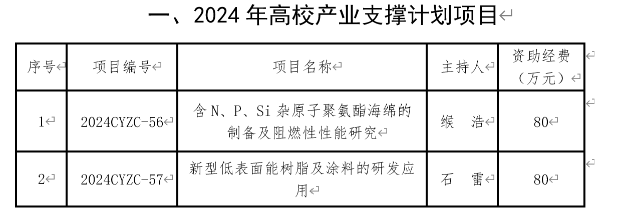 产业支撑计划项目主要以服务我省经济社会发展战略需求为导向,聚焦全省产业发展的关键核心技术问题,支持高校与骨干企业、科研院所产学研用结合协同创新、联合攻关,提升高校自主创新能力和成果转移转化能力而专门设立。2024年学校产业支撑计划项目立项2项,资助总经费160万元。