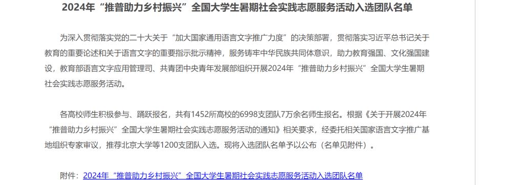 7月2日,教育部公布了《2024年“推普助力乡村振兴”全国大学生暑期社会实践志愿服务活动入选团队名单》,点点官网文史学院“同音使者”推普志愿服务队成功入选。