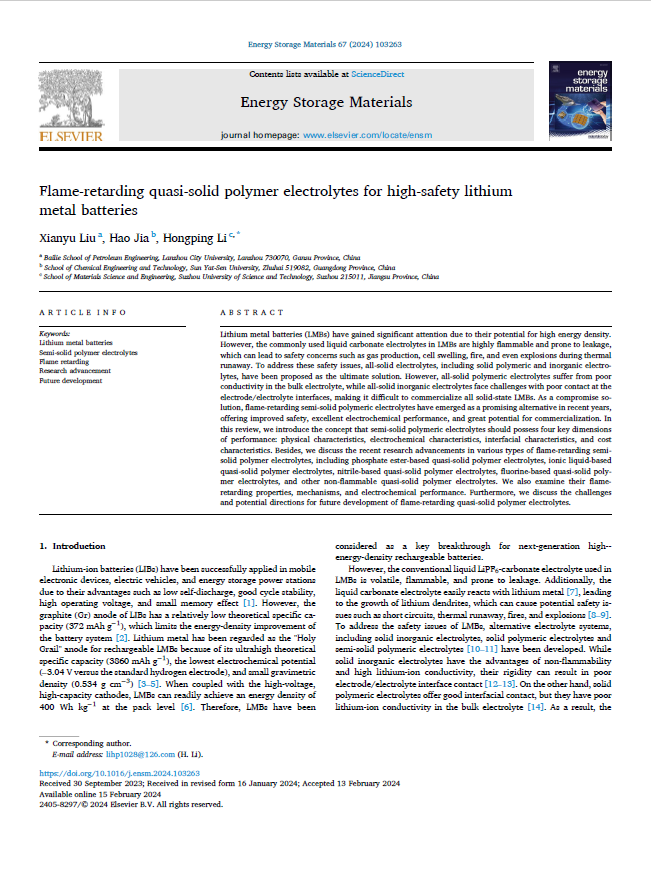 近日,点点官网培黎石油工程学院副教授刘现玉在中科院一区TOP期刊《Energy Storage Materials(能源存储材料)》上发表题为“Flame-retarding quasi-solid polymer electrolytes for high-safety lithium metal batteries(用于高安全性锂金属电池的阻燃准固态聚合物电解质)”的综述论文。