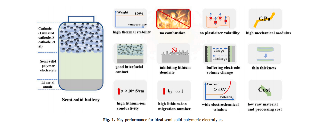锂金属电池因具有高的能量密度而备受关注。然而,锂金属电池常用的有机电解液具有易燃、易泄漏的风险,会导致诸多安全问题,如:产气、电芯鼓胀、着火、爆炸等。为解决这些问题,研究者们提出高安全半固态聚合物电解质作为解决方案之一。该论文从物理特性、电化学特性、界面特性、成本特性四个方面详细地介绍了高性能半固态聚合物电解质应满足的性能,提出阻燃半固态聚合物电解质的潜在研究方向:(1)开发和探索新型高效阻燃剂。(2)探索减少活性阻燃剂与电极的副反应的方法。(3)开发低成本的阻燃型准固体聚合物电解质。(4)以软包电池对阻燃半固态聚合物电解质进行评估。(5)关注电解液/电极的反应性、锂的均匀沉积、电池热失控和电池优异的整体性能等。(6)开发先进的阻燃半固体电池测试和表征技术。