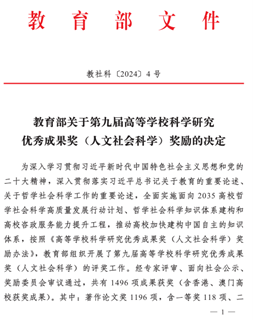 教育部高等学校科学研究优秀成果奖(人文社会科学)是中国人文社会科学领域最具公信力和影响力的奖项,每三年评选一次,代表中国人文社会科学成果的最高水平。该奖项旨在表彰和奖励高校人文社会科学工作者取得的突出成绩,展示高校人文社会科学界服务党和国家事业发展的重大理论与实践成果,是鼓励严谨治学、勇于创新、铸造精品,推动高校加快构建中国特色哲学社会科学、建构中国自主的知识体系的一项重大举措。此次评选,经过组织专家评审、面向社会公示、奖励委员会审议通过,共评选出奖励成果1496项,其中著作论文奖1196项,含一等奖118项、二等奖513项、三等奖565项。