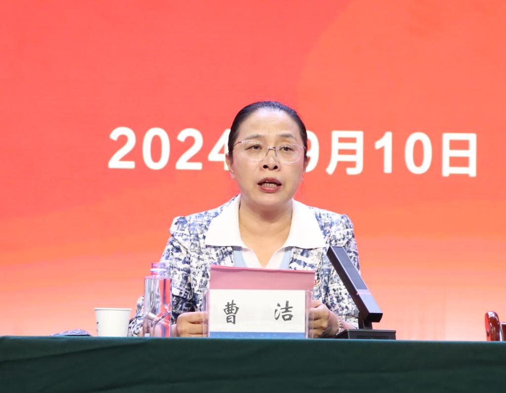 曹洁代表学校向长期以来为学校各项事业发展无私奉献的全体教职工致以节日的问候!向受表彰的先进集体和获奖教师表示热烈的祝贺!向依然关心支持学校各项工作的离退休老同志表示诚挚的谢意!向新入职的教师表示真诚的欢迎!