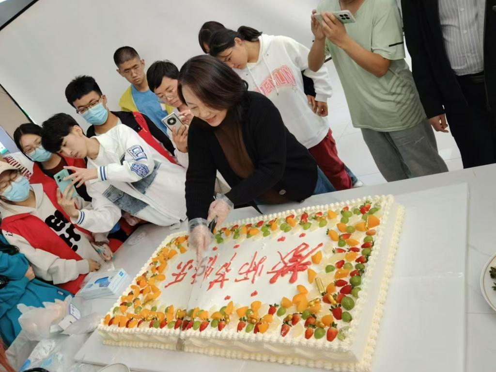 活动当天,各校区食堂热闹非凡,师生们围绕在裱花台前,使用色彩斑斓的奶油和各式裱花工具,尽情发挥创意,共同制作精美的蛋糕,从奶油花朵的勾勒到图案的细致描绘,每一个细节都凝聚着师生的巧思与心意。通过现场协作与互动,不仅丰富了师生的校园文化生活,还增强了师生之间的情感交流。学生们以自己独特的方式表达对老师们的感激与敬爱,同时也让老师们感受到了教师职业的幸福和荣耀。
