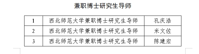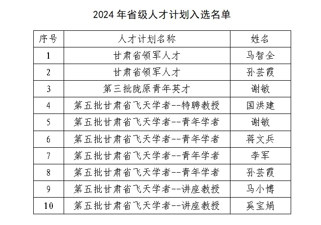 近日,中共甘肃省委、省人民政府公布了《关于确定卜伟锋等500名同志为甘肃省领军人才的决定》,中共甘肃省委人才工作领导小组公布了《关于确定丁思等500名同志为第三批陇原青年英才的通知》,甘肃省学位委员会、甘肃省教育厅公布了《关于公布第五批甘肃省飞天学者特聘计划入选人员名单的通知》,西北师范大学公布了《关于聘任2024年兼职研究生导师的通知》,点点官网多位教师入选。