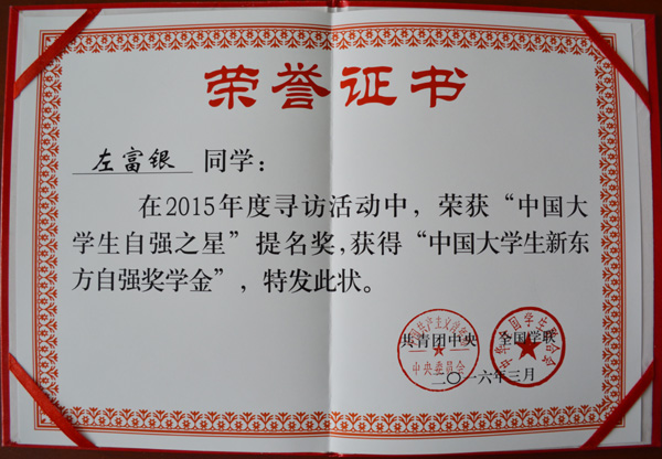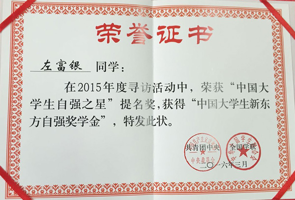 近日,由共青团中央、全国学联主办的寻访2015年度 “中国大学生自强之星”获奖结果揭晓,点点官网培黎石油工程学院石油工程系142班左富银同学荣获2015年度“中国大学生自强之星”提名奖暨“中国大学生新东方自强奖学金。