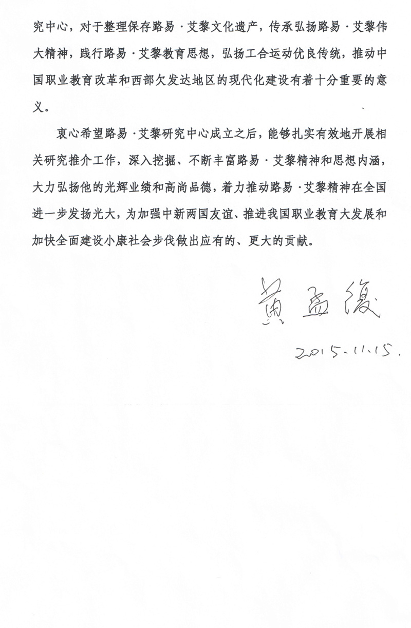 日前,十一届全国政协副主席、全国工商联名誉主席黄孟复致信祝贺路易•艾黎研究中心成立,贺信全文如下: