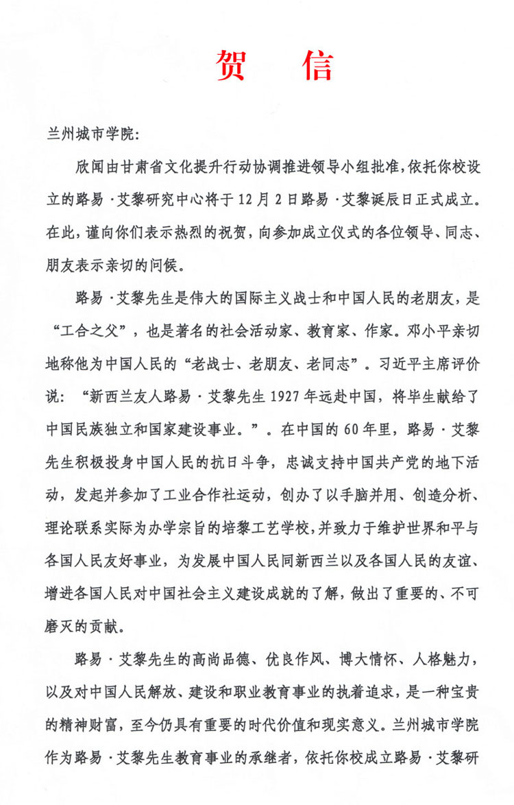 中国人民对外友好协会会长李小林致信祝贺路易•艾黎研究中心成立