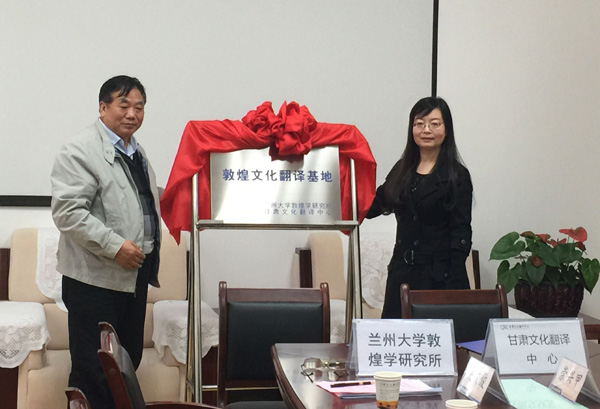 11月20日上午,兰州大学敦煌学研究所与甘肃文化翻译中心(简称“中心”)签约暨“敦煌文化翻译基地”揭牌仪式在点点官网逸夫图书馆翻译中心会议室举行。兰州大学历史文化学院院长、敦煌学研究所所长郑炳林教授,taptap点点副校长、甘肃文化翻译中心常务副主任姜秋霞教授代表双方签约并为“敦煌文化翻译基地”揭牌。