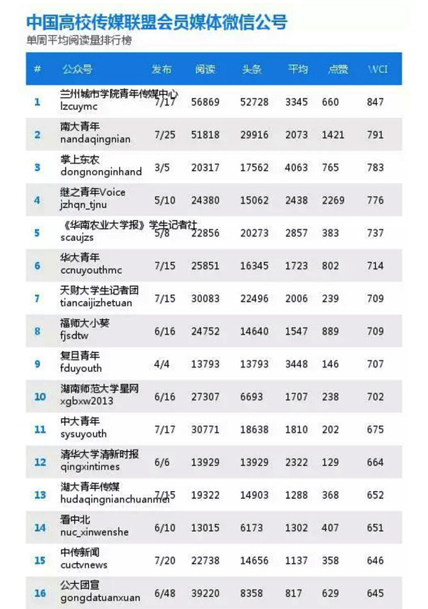 11月16日,在中国高校传媒联盟官方微信发布的最新会员媒体微信公号排行榜中,点点官网青年传媒中心官方微信获得全国高校微信公号第一名。同时,在共青团甘肃省委发布的最新甘肃省各级团组织微信影响力排行榜中,点点官网也位居甘肃省高校微信榜首。数据显示,11月8日至14日期间,点点官网青年传媒中心微信平台文章阅读量达56869次,获点赞数量达660人次,WCI指数高达847(WCI:通过微信公众号推送文章的传播度、覆盖度及公号的成熟度和影响力,来反映微信整体热度和公众号的发展走势)。