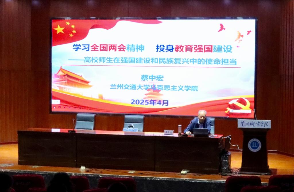 为全面深入学习领会习近平总书记在全国两会期间发表的系列重要讲话精神和全国两会通过的报告和文件精神,按照省委教育工委统一部署,4月25日下午,学校举办“理响校园·培根铸魂”全国两会精神示范性宣讲活动。兰州交通大学马克思主义学院蔡中宏教授、甘肃政法大学法学院2024级硕士研究生朱昱锟应邀做宣讲报告。会议由党委宣传部负责人主持。