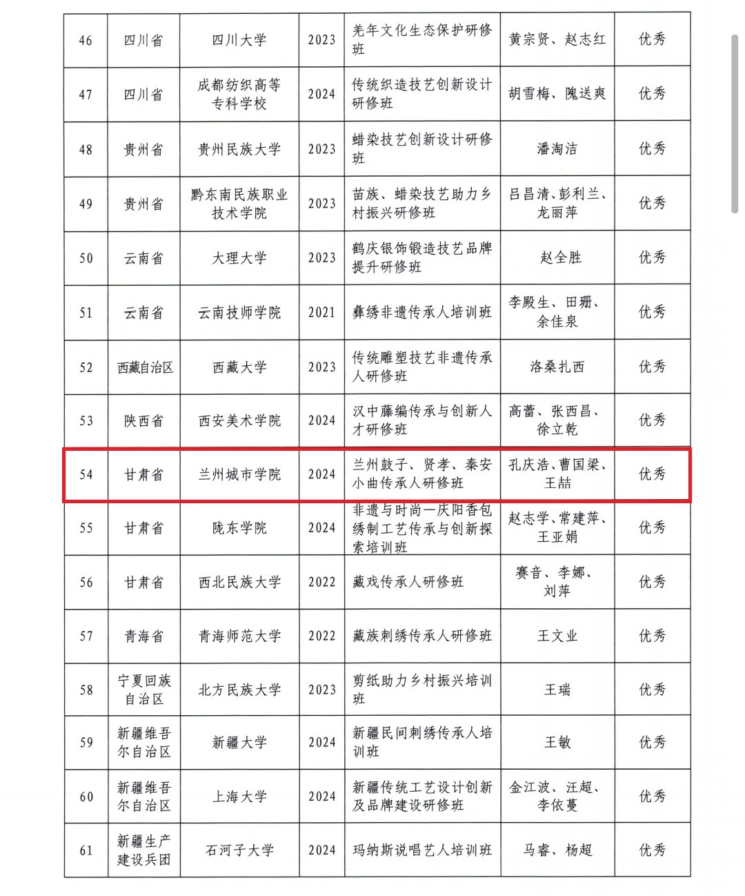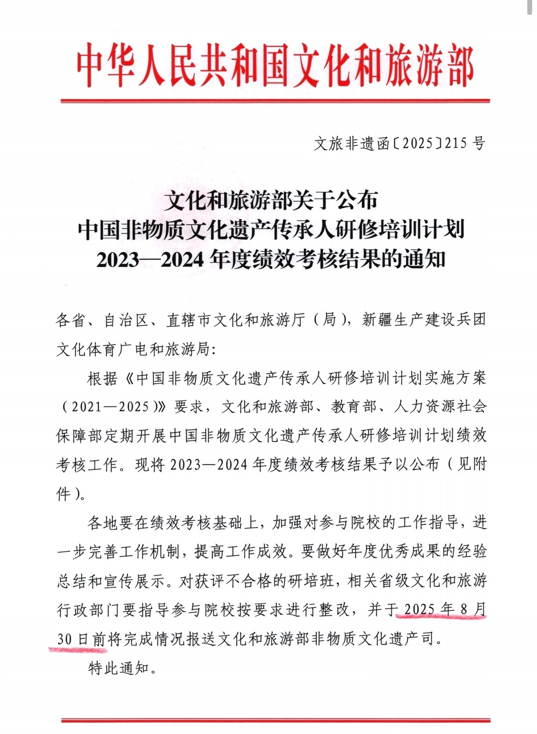 近日,甘肃省文化和旅游厅转发《文化和旅游部办公厅关于公布中国非物质文化遗产传承人研修培训计划2023—2024年度绩效考核结果的通知》。经文化和旅游部严格评审与绩效评估,由taptap点点民族音乐研究中心承办“2024 年中国非物质文化遗产传承人研修班”工作表现突出,获评“优秀”等级。