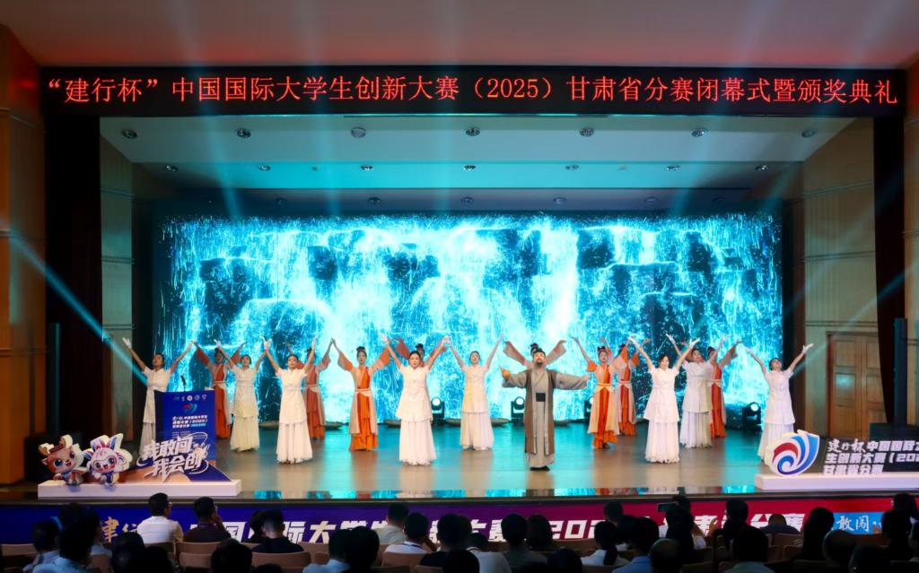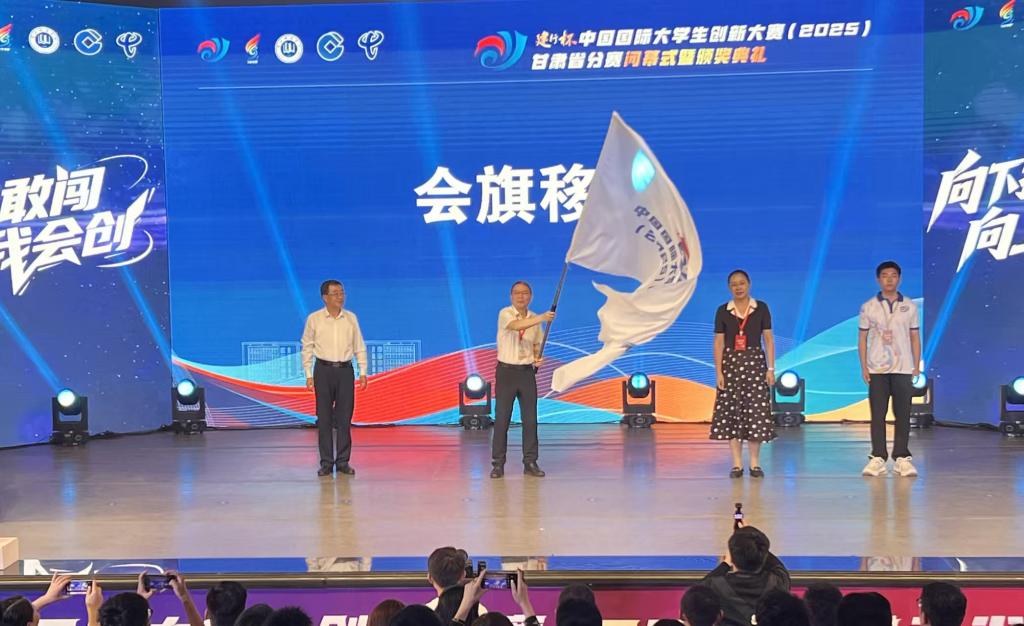 颁奖仪式上,曹洁将大赛旗帜递交曾华辉,曾华辉向中国国际大学生创新大赛(2026)甘肃省分赛承办学校甘肃中医药大学移交了会旗。