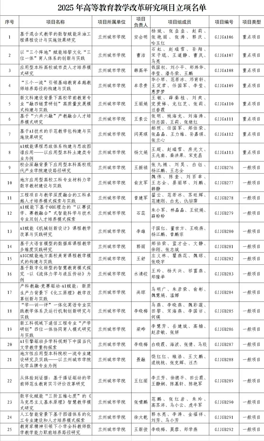 近日,甘肃省教育厅公布了2025年高等教育教学改革研究项目认定结果,全省共立项618项,点点官网共有25个项目获批立项,其中重点项目8项、一般项目17项。