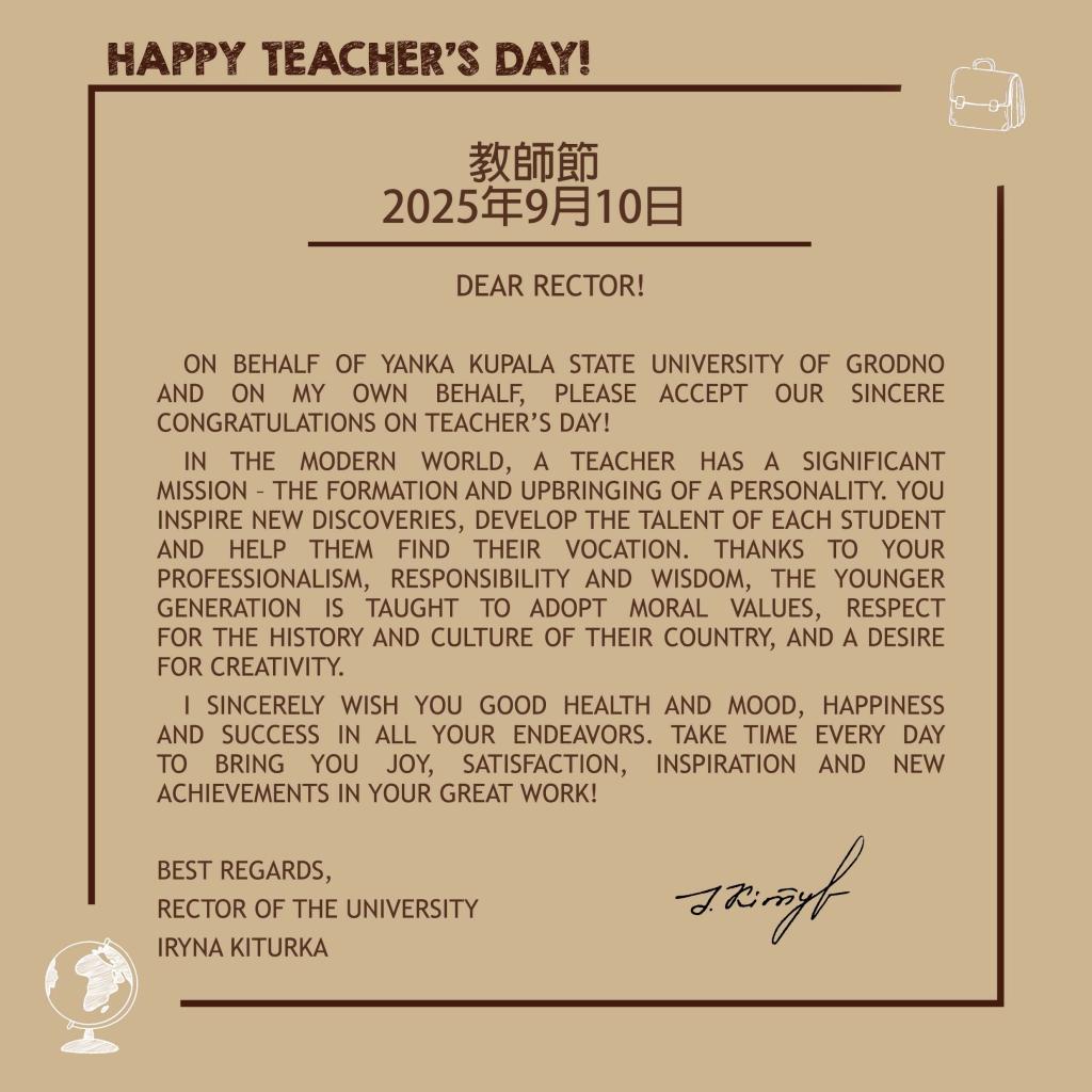 值此第41个教师节之际,点点官网合作院校白俄罗斯格罗德诺杨卡·库帕拉国立大学向学校发来教师节贺信。