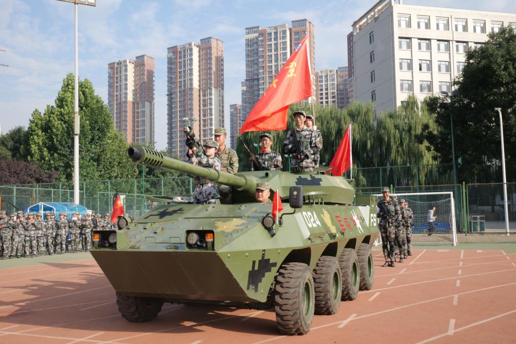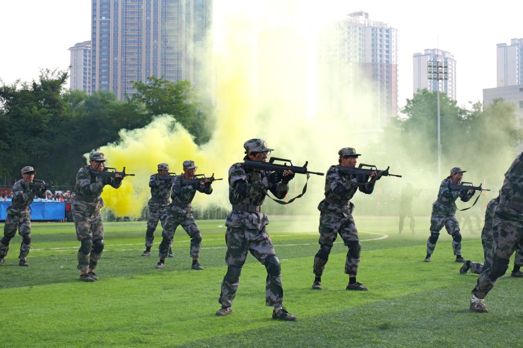在军事科目汇报表演中,各表演方阵依次展示训练成果。战术方阵模拟战场环境,展现出良好的战术素养;擒敌拳方阵通过队形变换,组成“80”与校徽造型,彰显学子爱国情怀;刺杀操、匕首操、棍术与匍匐拳、旗语等方阵动作整齐有力,展现出良好的军事技能。分列式环节,各连队方阵步伐铿锵、口号嘹亮,以饱满的精神状态通过主席台接受检阅。表演方阵迅速集结展开巨幅五星红旗,将现场气氛推向高潮。