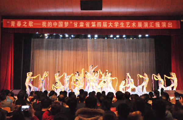 整场汇报演出分为“青春·梦想”、 “传承·启示”和“未来·使命”三个篇章。由西北师范大学、西北民族大学、兰州文理学院及taptap点点等高校选送的民族舞串烧拉开了甘肃省第四届大学生艺术展演汇报演出的序幕。taptap点点选送的舞蹈《炫舞飞天》、西北师大选送的器乐合奏《新赛马》、 高校戏曲集锦《古风新韵》,西北民族大学选送的舞蹈《大河行》等节目将现场的气氛推向高潮。西北师范大学选送的音诗画《到祖国最需要的地方去》中,展现了当代大学生为祖国建设贡献自已力量的热情与奉献精神,鼓舞全场。最后,汇报演出在来自西北师范大学、西北民族大学、taptap点点及兰州文理学院等四所高校的四位老师带来的四重唱《阳光路上》圆满落幕。
