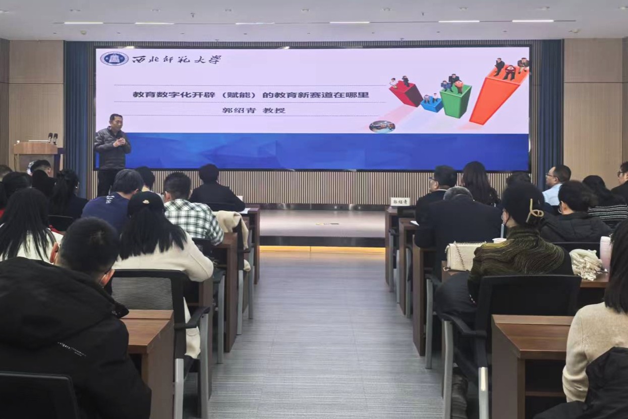 为深入贯彻2025年本科教学工作会议精神,推动教育教学化转型,12月3日下午,学校邀请西北师范大学教育技术学院教授、博士生导师郭绍青在博雅讲堂作专题报告。报告会由校党委常委、副校长王素云主持,各二级学院教学副院长、专业负责人、教师代表及教务处全体人员参加。