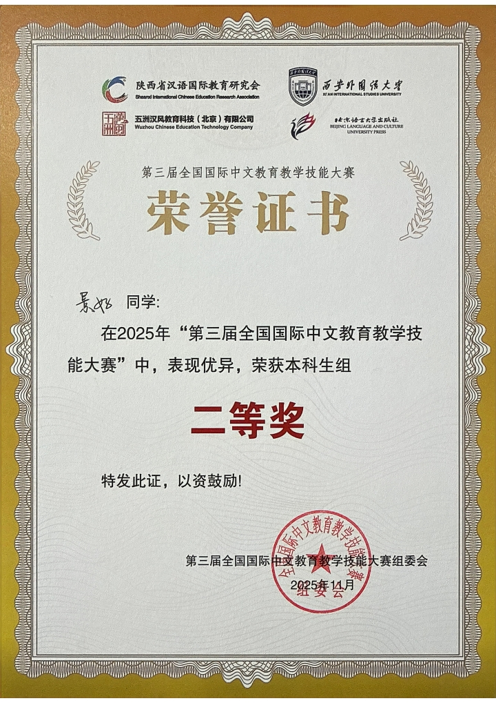 近日,第三届全国国际中文教育教学技能大赛在西安外国语大学举行。点点官网文史学院汉语国际教育专业学子在比赛中取得优异成绩,其中景好同学获本科组二等奖,陈逸、苑飞雁、刘世美慧三位同学均获优秀奖。
