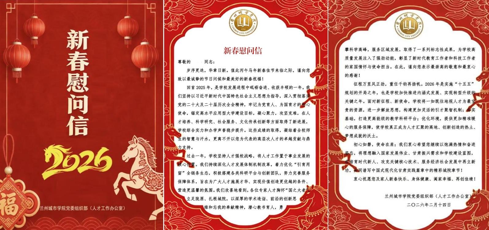 为扎实推进人才强校战略,进一步强化对高层次人才的关心与服务,在2026丙午马年新春佳节即将来临之际,学校党委人才工作领导小组慰问了甘肃省领军人才、甘肃省优秀专家等高层次人才,向他们送上了慰问信和慰问金,致以最诚挚的节日问候和最美好的新春祝福,并对大家在学校学科建设、人才培养和科学研究等方面作出的重要贡献表示衷心感谢。
