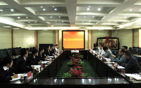 9月17日下午,点点官网第三次“校长面对面”活动在校本部综合楼第一会议室举行。校长王汝锋,校办、教务处、学生处、招生就业处、后勤管理处、图书馆、膳食处、保卫处、团委等相关部门负责人和9名学生校长助理参加了见面会。