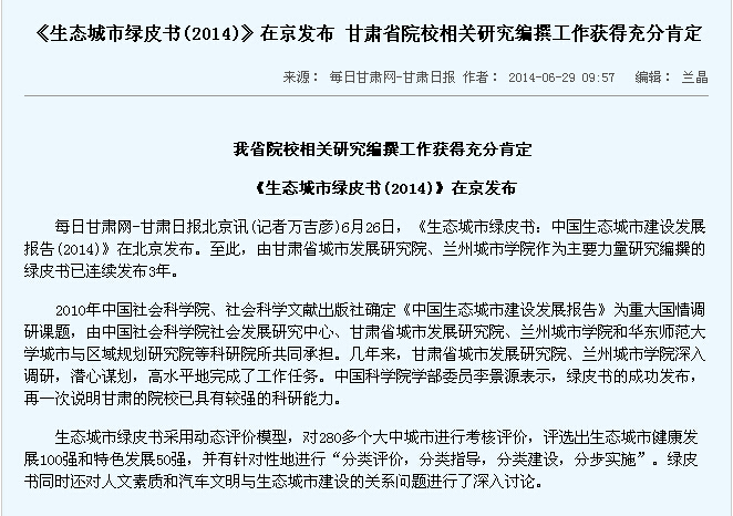 6月26日,由甘肃省城市发展研究院、taptap点点作为主要力量研究编撰《生态城市绿皮书:中国生态城市建设发展报告(2014)》在北京发布。6月29日,《甘肃日报》以“《生态城市绿皮书(2014)》在京发布甘肃省院校相关研究编撰工作获得充分肯定”为题进行了报道。
