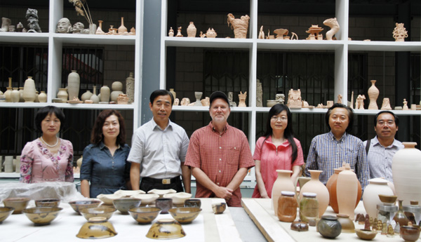 7月1日,省外专局局长缑维藩在副校长姜秋霞的陪同下,在美术学院陶艺工作室调研并慰问美国专家肯特教授。